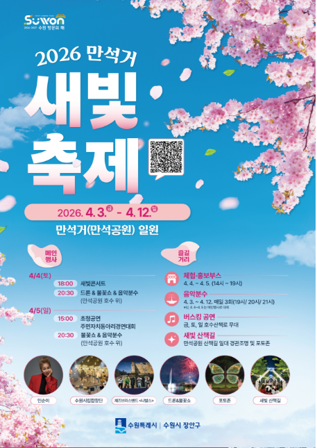 안녕하세요! 오늘은 수원의 봄을 가장 화려하게 즐길 수 있는 축제 소식을 들고 왔습니다. 바로 2026 만석거 새빛축제인데요. 세계 관개시설물 유산인 만석거의 역사적 가치와 함께 아름다운 야경을 즐길 수 있는 이번 축제의 핵심 정보를 정리해 드립니다이번 축제의 중심은 이름 그대로 ‘빛’입니다.공식 안내에 따르면 주요 내용은 만석거 새빛하늘(드론·불꽃놀이, 음악분수 미디어아트 등), 경관조명 산책길, 버스킹으로 구성됩니다. 그래서 낮보다 저녁 시간대에 더 분위기가 살아나는 봄 야간축제라고 정리하면 이해하기 쉽습니다축제는 10일 동안 이어지지만, 하이라이트는 아무래도 4월 4일 토요일과 4월 5일 일요일에 몰려 있습니다. 공식 안내문 기준으로 4월 4일 오후 6시 새빛콘서트, 오후 8시 30분 드론 & 불꽃..
